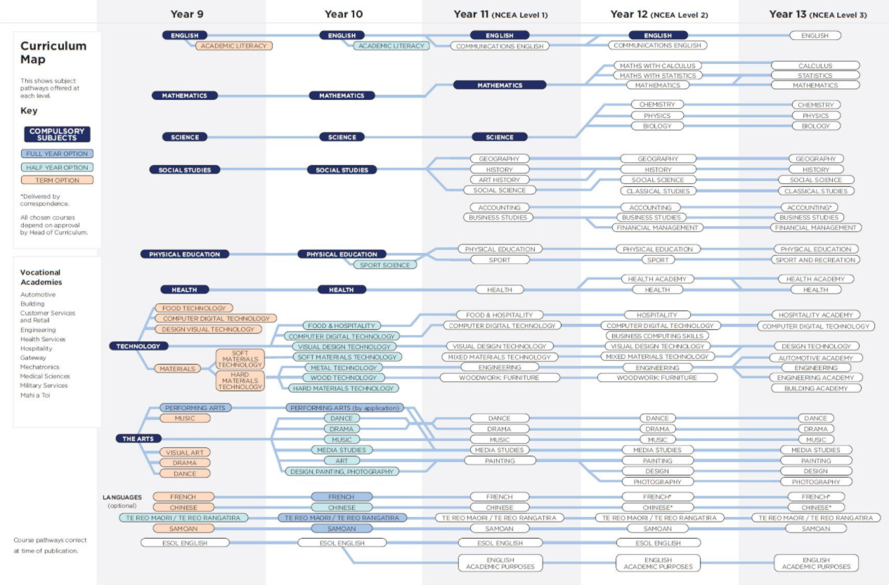 Typ kurzu 11 týždňov 21 týždňov 31 týždňov 41 týždňov Stredoškolské štúdium $NZ11 450 $NZ19 450 $NZ27 450 $NZ35 000 Školský rok začína koncom januára a končí koncom decembra. Delí sa na 4 štrvrťroky/terms. Medzi jednotlivými termi sú 2-týždenné prázdniny. Študenti môžu začať štúdium ktorýkoľvek term.